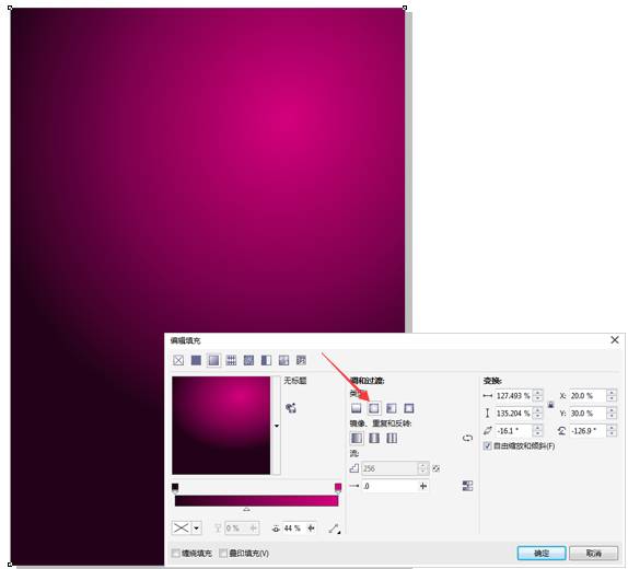 步骤二、渐变填充 按F11键打开“渐变填充”对话框,设置渐变类型为“射线”,颜色从深紫(C:80,M:100,Y:70,K:70)到紫色(C:0,M:100,Y:0,K:30),单击确定按钮后,得到图形的渐变效果。