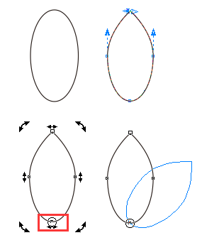 步骤十、旋转复制对象 下面来绘制一个标志图形。单击椭圆形工具,绘制一个椭圆形并右键转曲,使用“形状工具”调整节点呈花瓣状。再次单击对象将中心点放到图形底部。按住鼠标向右旋转对象,到适当位置后右击,得到复制的图形。