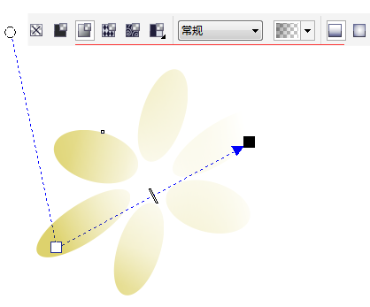 步骤六、应用透明效果 选择所有椭圆形,单击透明度工具,对图形应用透明效果。在属性栏中设置透明类型为线性,再设置其他参数,得到整个花瓣的透明效果。