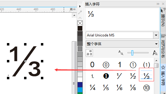 5. 从“整个字体”列表框中选择心仪字体,选择要插入的分数符号,直接拖拽到工作区域即可;或者把符号字符当做一个文本插入。使用文本工具,在页面的空白位置上单击一下,就会出现一个闪烁的光标,鼠标双击符号字符面板上的某个符号。