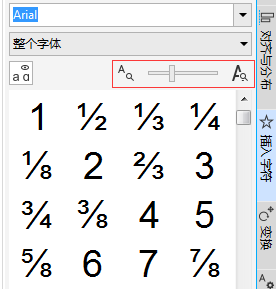 2. 在界面右侧会弹出“插入字符”面板,在“插入字符”泊坞窗中出现各种各样的符号字符,首先能够看到的就是分数字符。