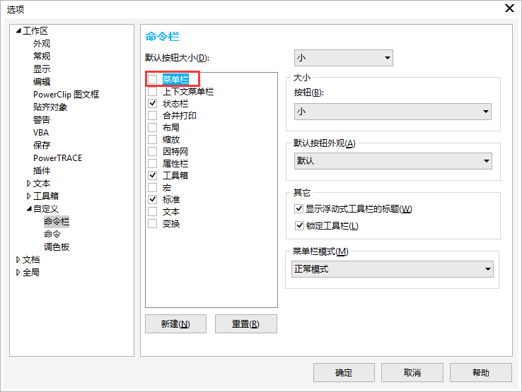 方法四、安快捷键Ctrl+J,弹出“选项”对话框,单开左侧面板“工作区>自定义>命令栏”,在“命令栏”子面板中“菜单栏”即可即时显示CorelDRAW界面中的菜单栏。