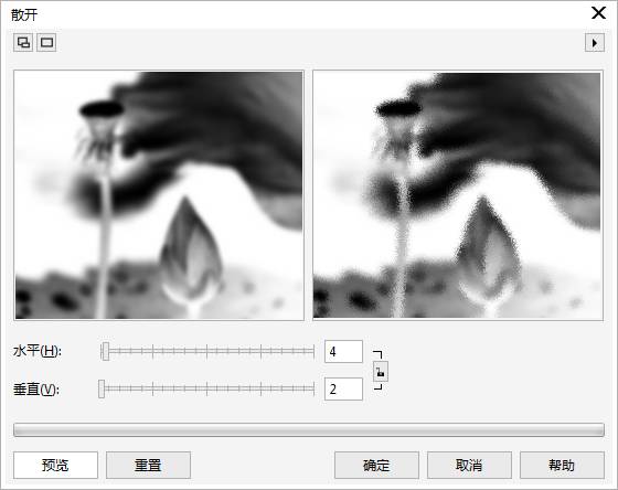 6、再执行“位图>创造性>散开”。水平数值4,垂直数值2,到这一步,水墨画的效果已经出来了。