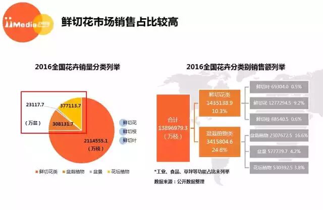2016年全国花卉销量中,鲜切花类花卉销量为2114555.1万枝,鲜切花类在花卉销量中仍有较大贡献。而从销售额来看。盆栽植物类却以24.6%的销售额占比超越鲜切花类。艾媒咨询分析师认为,盆栽植物单价较鲜切花类更高,且其相较鲜切花更易保养和运输,在对大众消费习惯进行合理引导下,未来盆栽植物类用户市场有较大发展潜力。