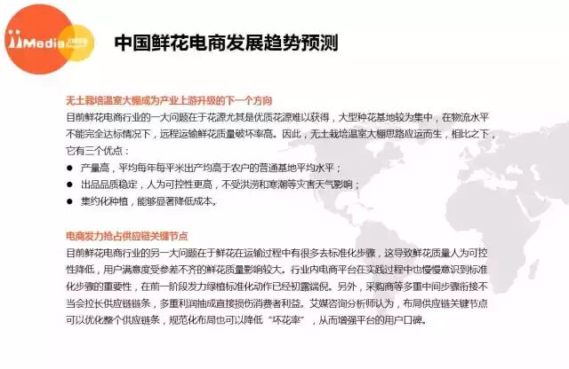 艾媒咨询分析师认为,未来鲜花电商市场会向全品类延伸,一些优势不明显的平台将退出竞争。另一方面,由于鲜花本身保质期较短,全地域垄断的现象暂时不会发生,把控供应链成为商家集中考虑的发展方向。