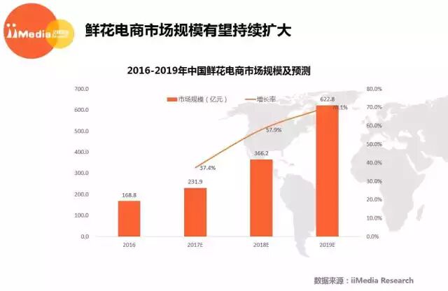 iiMedia Research(艾媒咨询)数据显示,2016年鲜花电商市场市场规模达168.8亿元,且以较高增长率增长,2019年预计市场规模能突破600亿元。