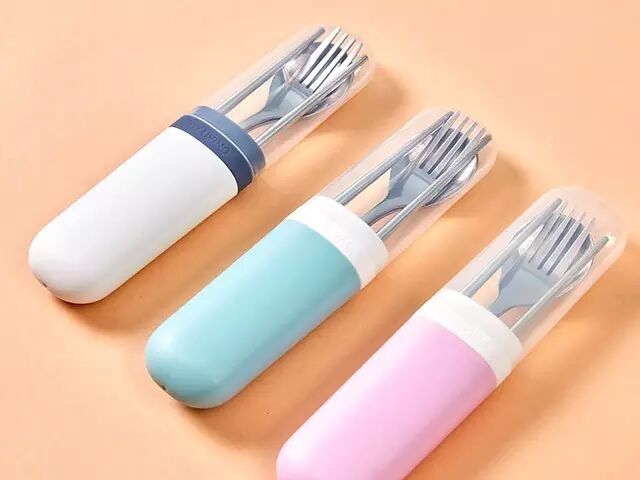 一套便携餐具,包含1双不锈钢筷子、1个不锈钢勺、1个不锈钢叉。