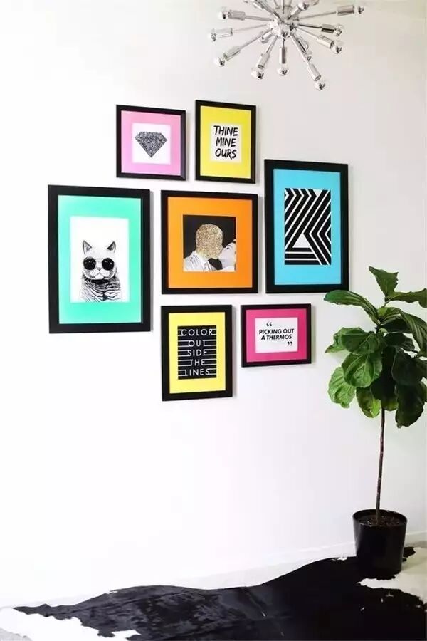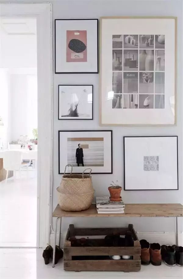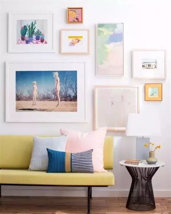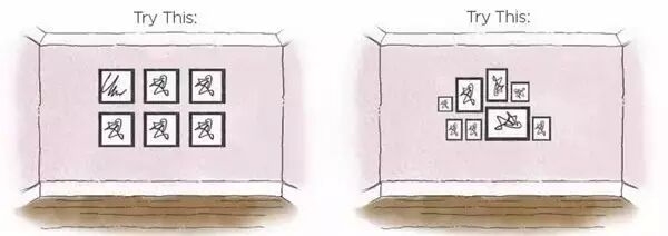 如果你喜欢将不同大小的画作组合在一起,可以将一幅(主要的)画挂在适当的位置和高度,再以它为延伸向外挂放。