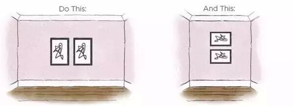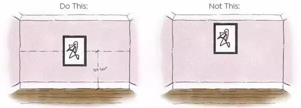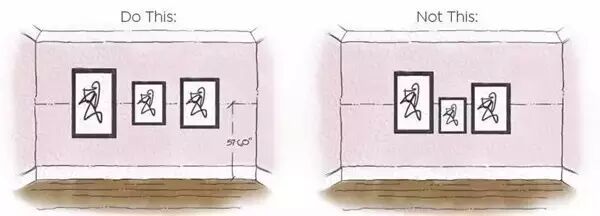 多幅不同大小的画作挂放时,不是以画作的底部(或顶部)为水平标准,而是以画作中心为水平标准。