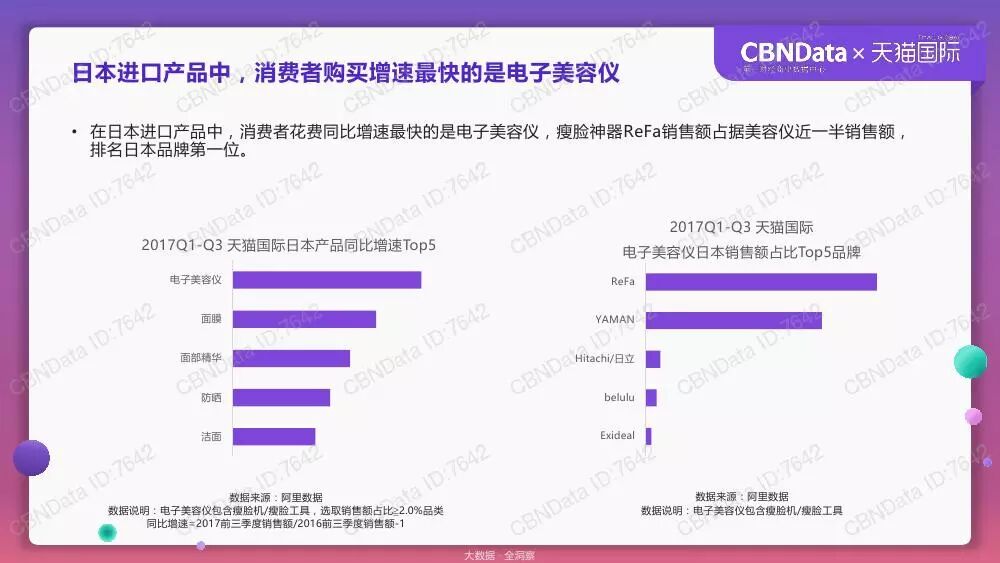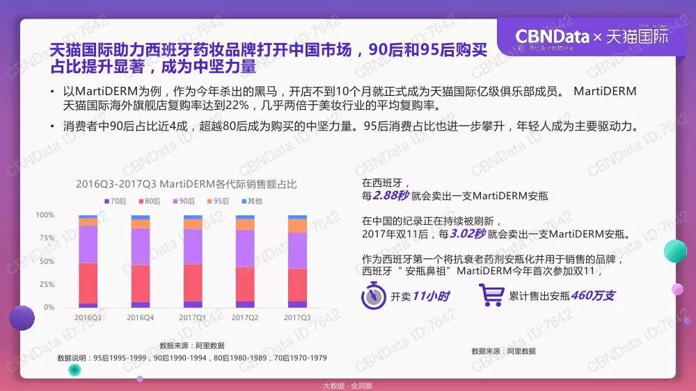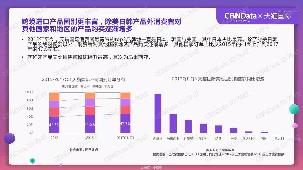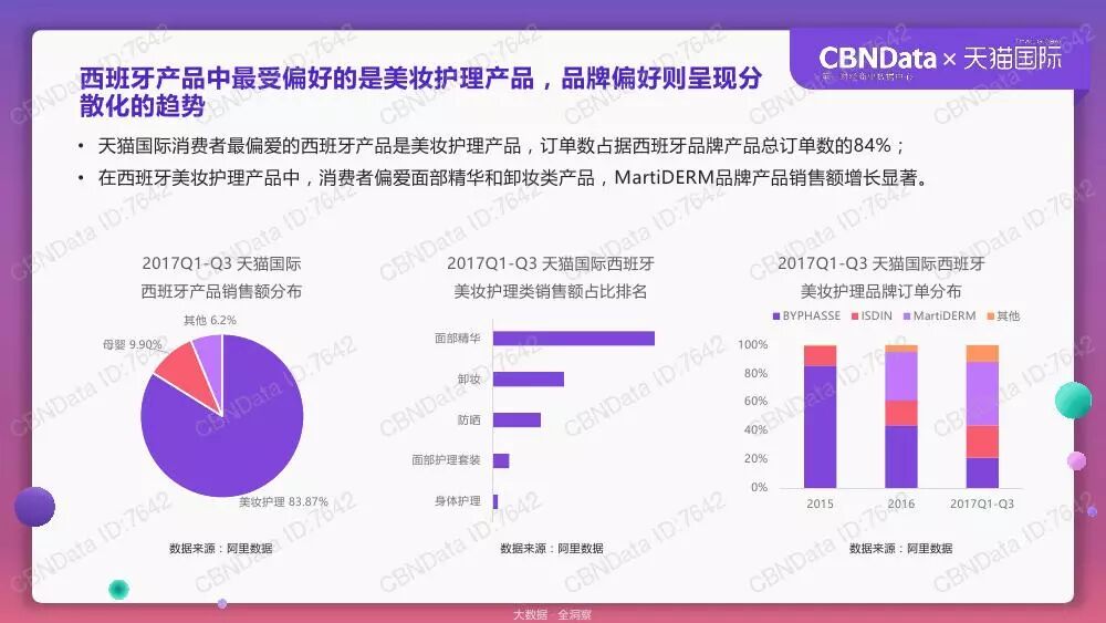 从跨境进口零售电商消费者年龄分布来看,90后和95后的消费贡献逐年提升,逐步成为天猫国际新主力消费人群;同时,90后和95后是进口美妆护理产品的主要消费群体,其中90后偏爱香水和面部护理产品,95后偏爱唇膏唇彩和粉饼产品。按进口产品国别来看订单分布,除了传统的日韩美位列前三之外,西班牙和马来西亚迅速崛起,其中以日本ReFa美容仪、西班牙MartiDERM和马来西亚正典燕窝表现尤为突出,CBNData《报告》结合天猫国际平台优势和一系列内容营销策略展开了解析。