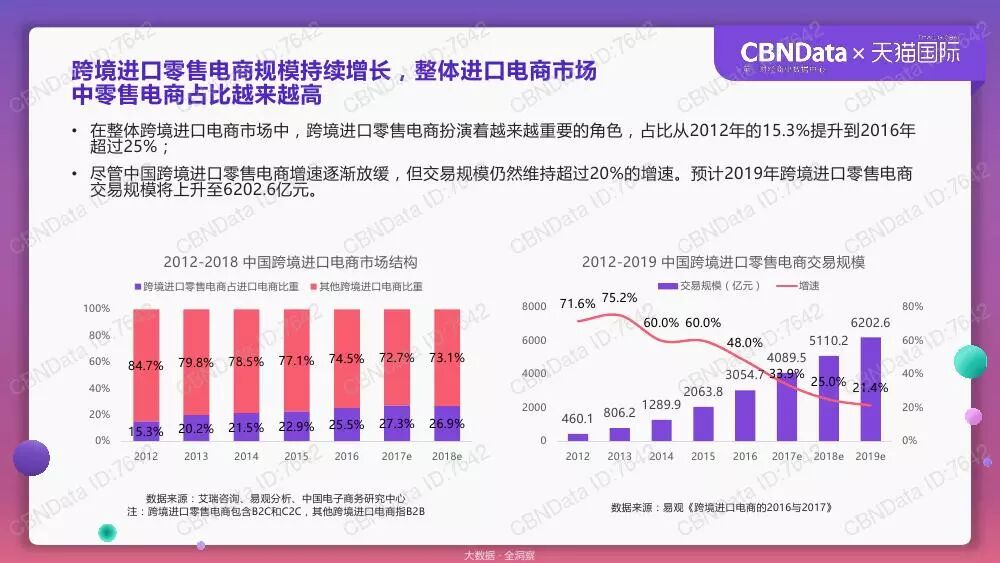 CBNData《报告》显示,在整体进口电商市场中,进口零售电商的重要性日益提升,占比从2012年的15.3%提升到超过25%。在中国跨境进口零售电商增速逐渐放缓的情况下,交易规模仍维持超过20%的增速,预计2019年跨境进口零售电商交易规模将上升至6202.6亿元。现阶段跨境进口零售电商市场75%以上为B2C综合电商平台,2017年第3季度天猫国际以25.4%的市场份额位居第一,京东全球购和网易考拉海购分别位居二、三位,三家总和占整体市场近60%的份额。