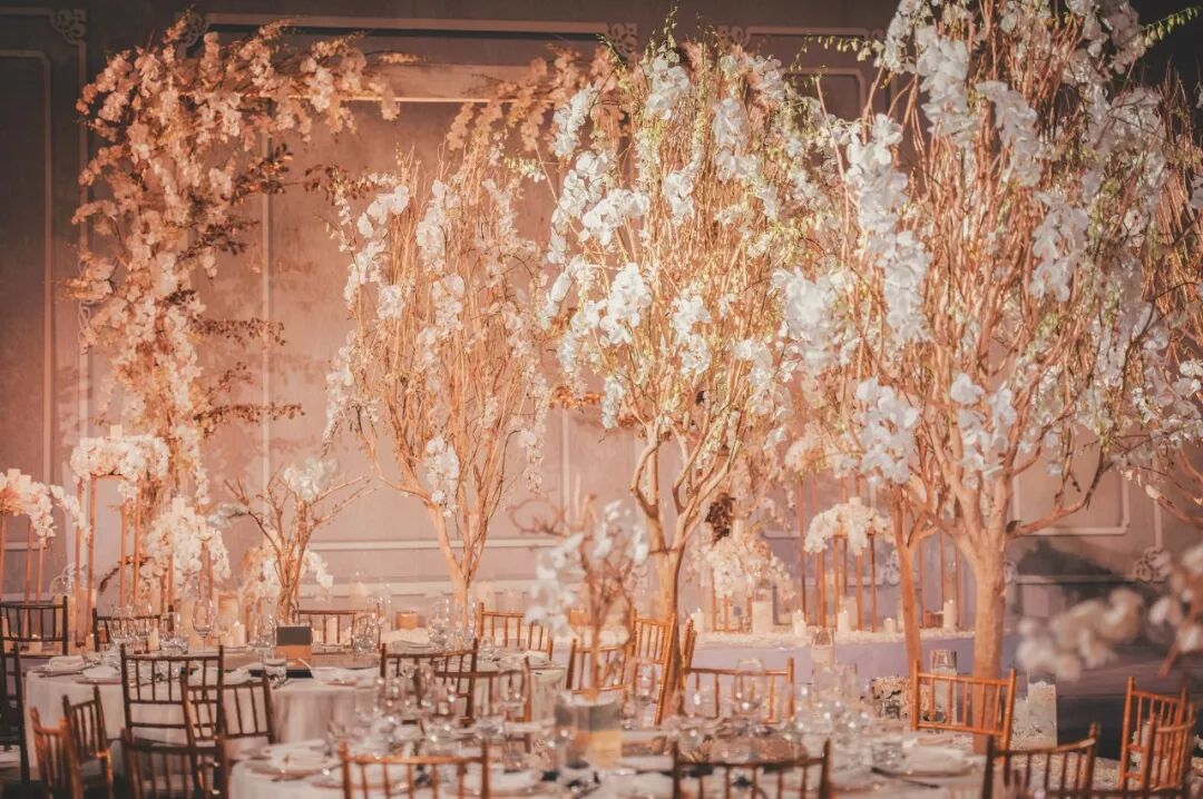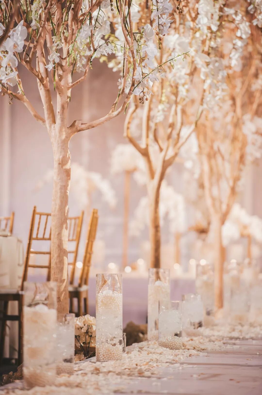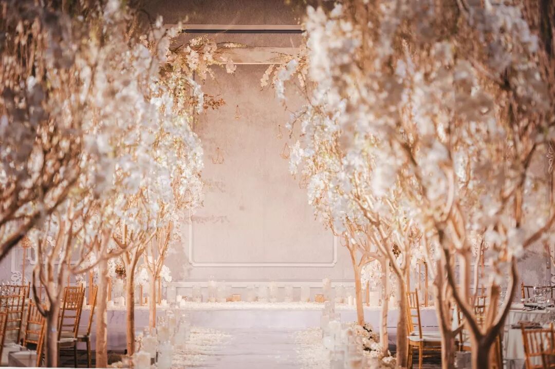 我们在布置上选择了最简洁的白色、灰色和金色,大量使用了原始的树木,保留了天然的枝条,然后在树枝条绑上洋兰加以装饰。