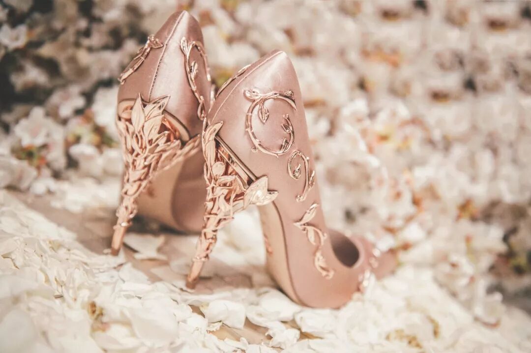 婚鞋我准备了两双。一双是去旅拍时买的Ralph and Russo的Eden,上面镶满了金属花纹,鞋跟也是金属的。这双鞋拍摄好,但穿它太重了结婚穿一天肯定很累。
