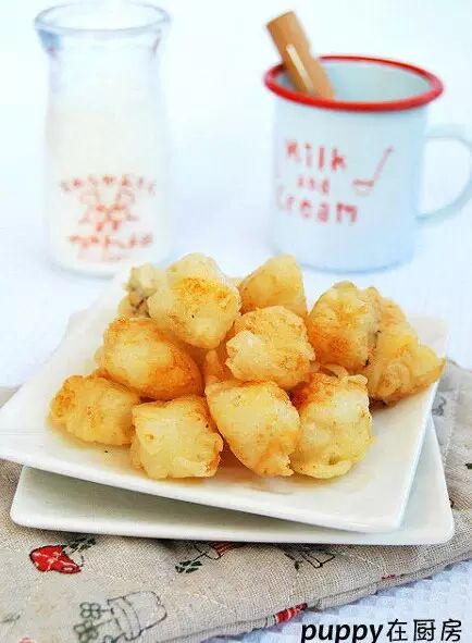 4、锅中倒油,加热至七、八成热,将鳕鱼块均匀的裹上酥炸糊,一块块地夹入油锅中,中火炸至金黄。