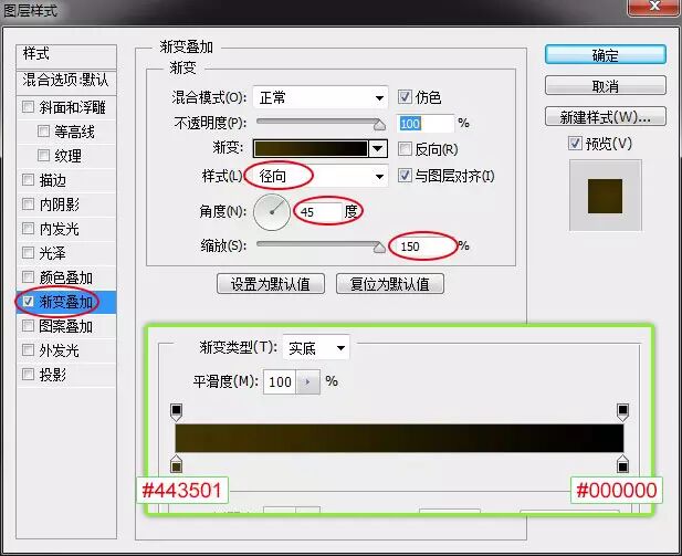 Tips:1.勾选“仿色”可以使渐变更加平滑;2.当样式为径向渐变时,角度选择45°渐变尺寸为最大。