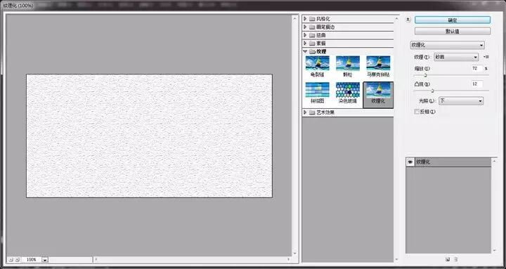 第2步:新建一个图层,填充为白色。此时确保前景色为白色,背景色为黑色。选择 滤镜>纹理>纹理化 ,选择“砂岩”效果,调整到合适参数。然后将此图层的混合模式调为“正片叠底”。