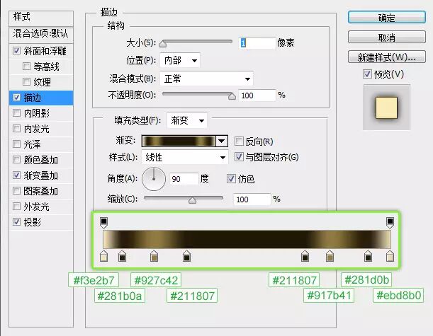 第5步:为图层添加1px的内描边效果,填充类型选择“渐变”,角度设置为90°。