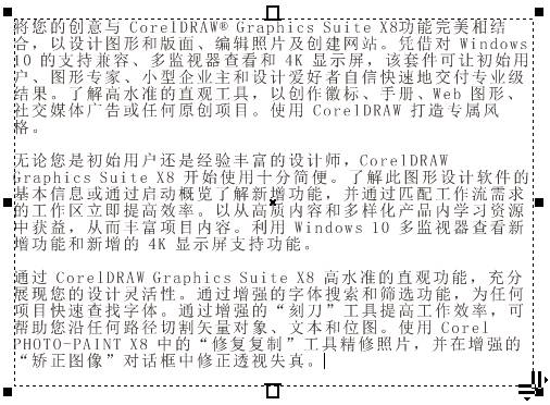 - 使用F8“文本工具”,在CDR绘图区域拖动鼠标实现段落文本框,在框内单击添加段落文字,或者也可以从已有文字中复制文本到文本框。如图所示。