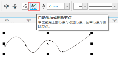 不同点②:此外,在钢笔工具的属性栏上还有一个“自动添加/删除节点”按钮,按下它在绘制时可以随时在画好的线条中增加和删除节点。