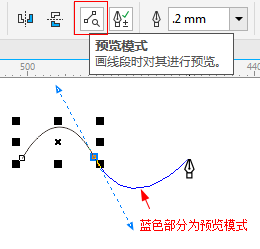 不同点①:使用钢笔工具时,可以预览您正在绘制的线段。钢笔工具的属性栏上有一个“预览模式”按钮,激活它后在绘制线条时能看见线条预先的状态。