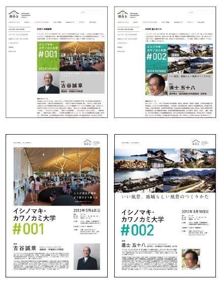 「Ishinomaki Kawanokami 大学」活动每年会举办 4 次,内容是招募大学教授等造镇专家来此协助。每次活动都是以宣传单或网站来通知活动讯息,大致决定宣传单与网站的格式后,展开具一致性的设计。