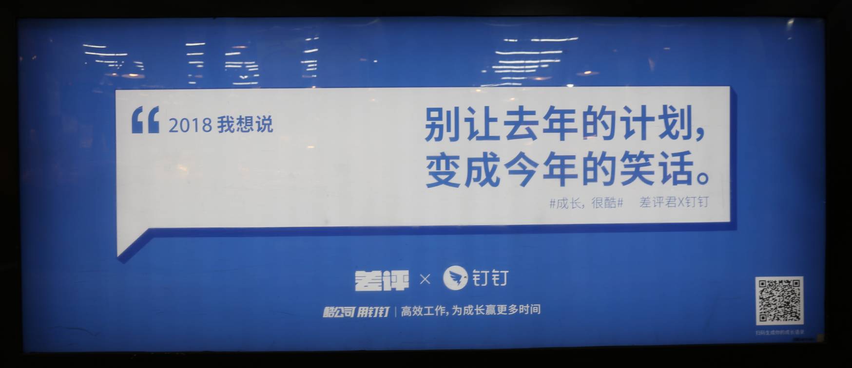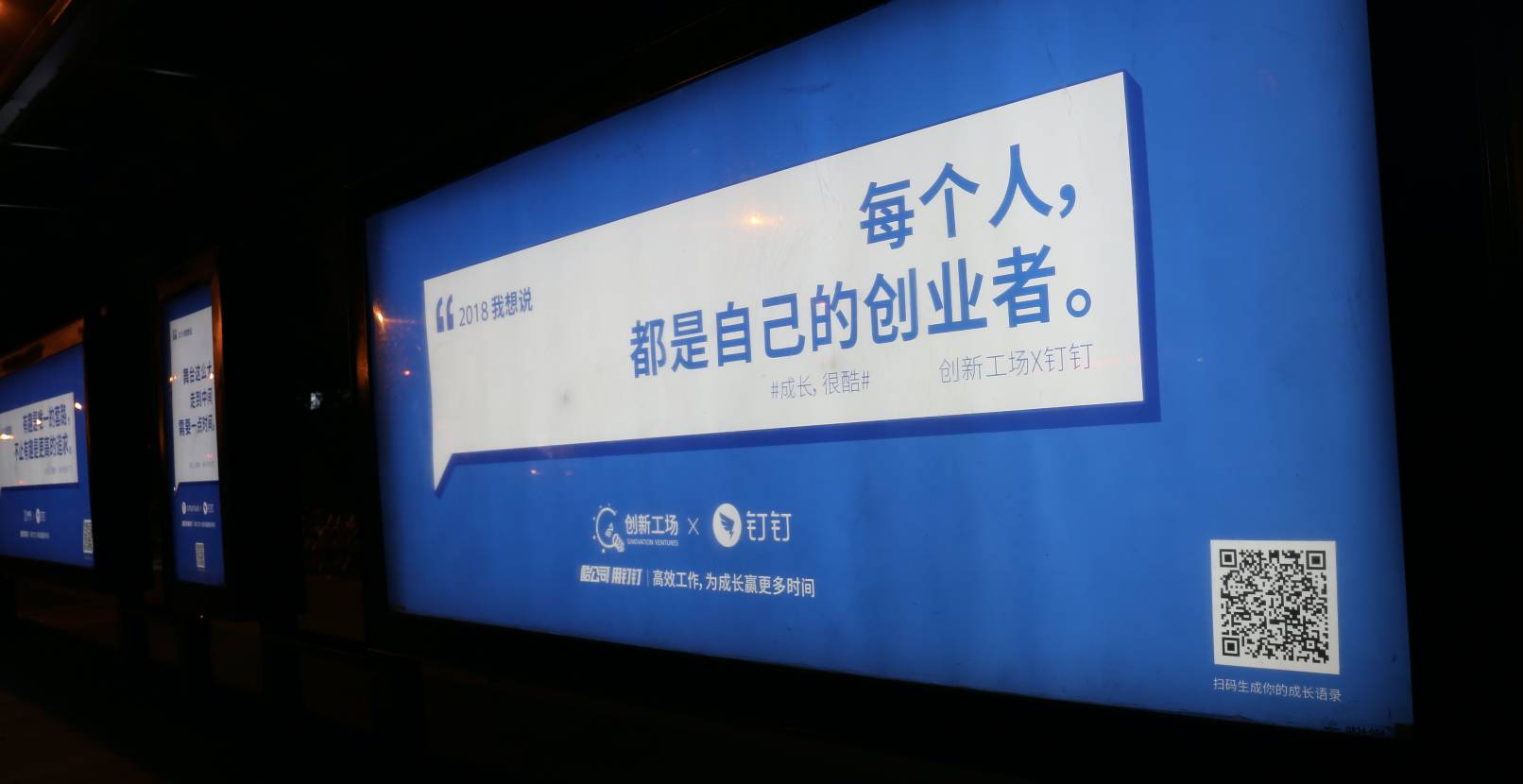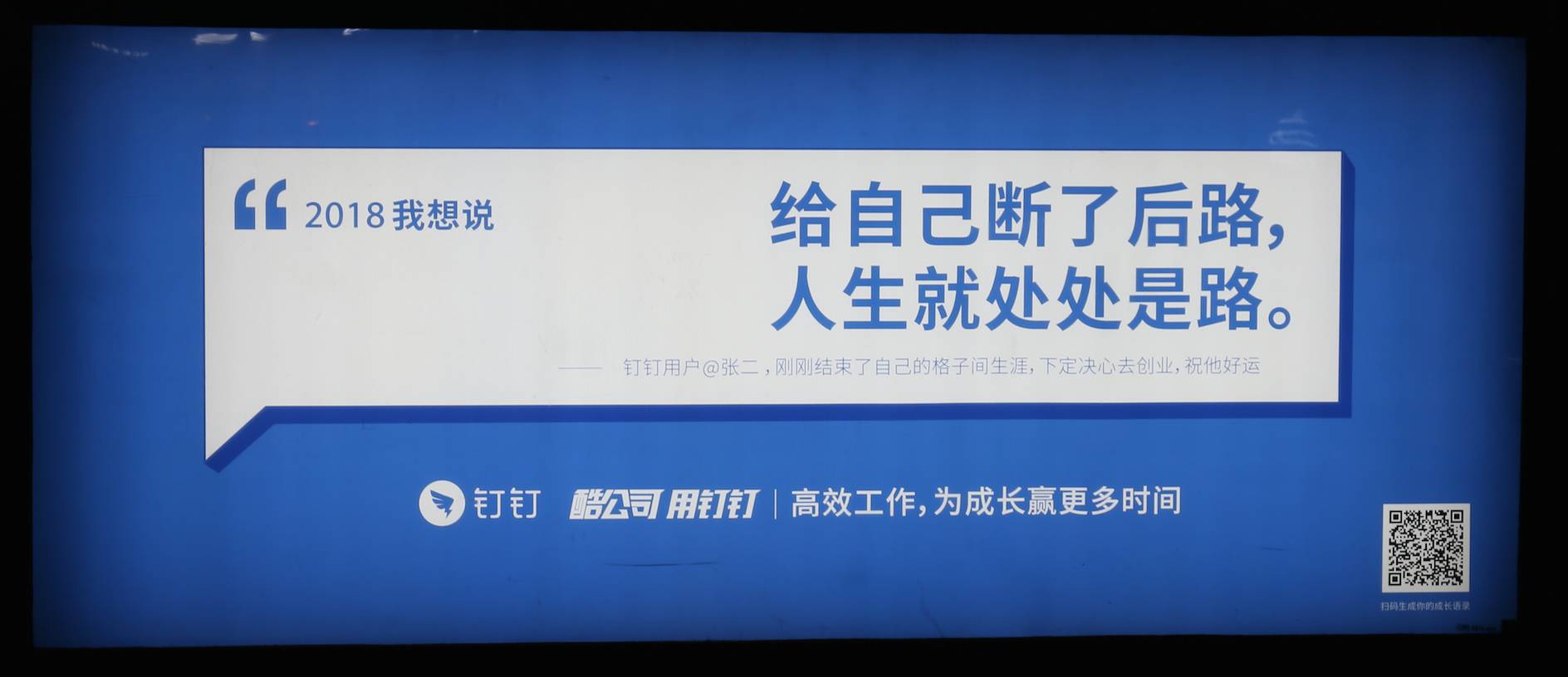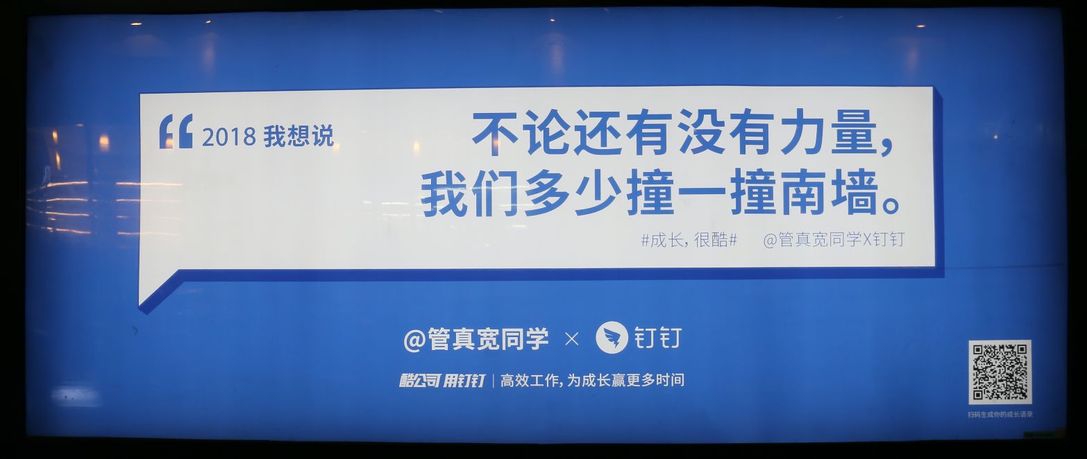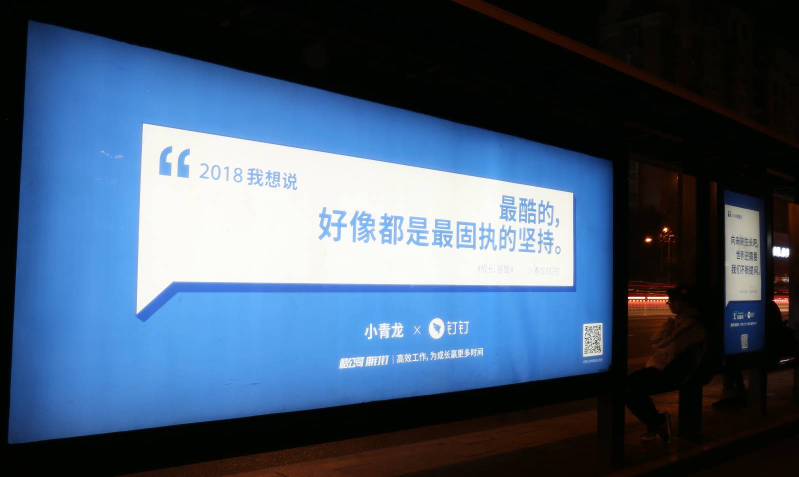 然而,就是在这个“人一励志,上帝就发笑”的风气下,马云的阿里巴巴钉钉却反其道而行之,最近在候车亭投放了一组主题为“成长,很酷”的公交站台广告,联合了60多个品牌、媒体、自媒体展开了一场对于2018年的集体对话,这60余句新年寄语,打动了无数正在奋斗中的人: