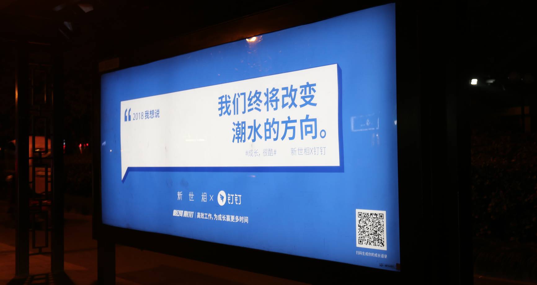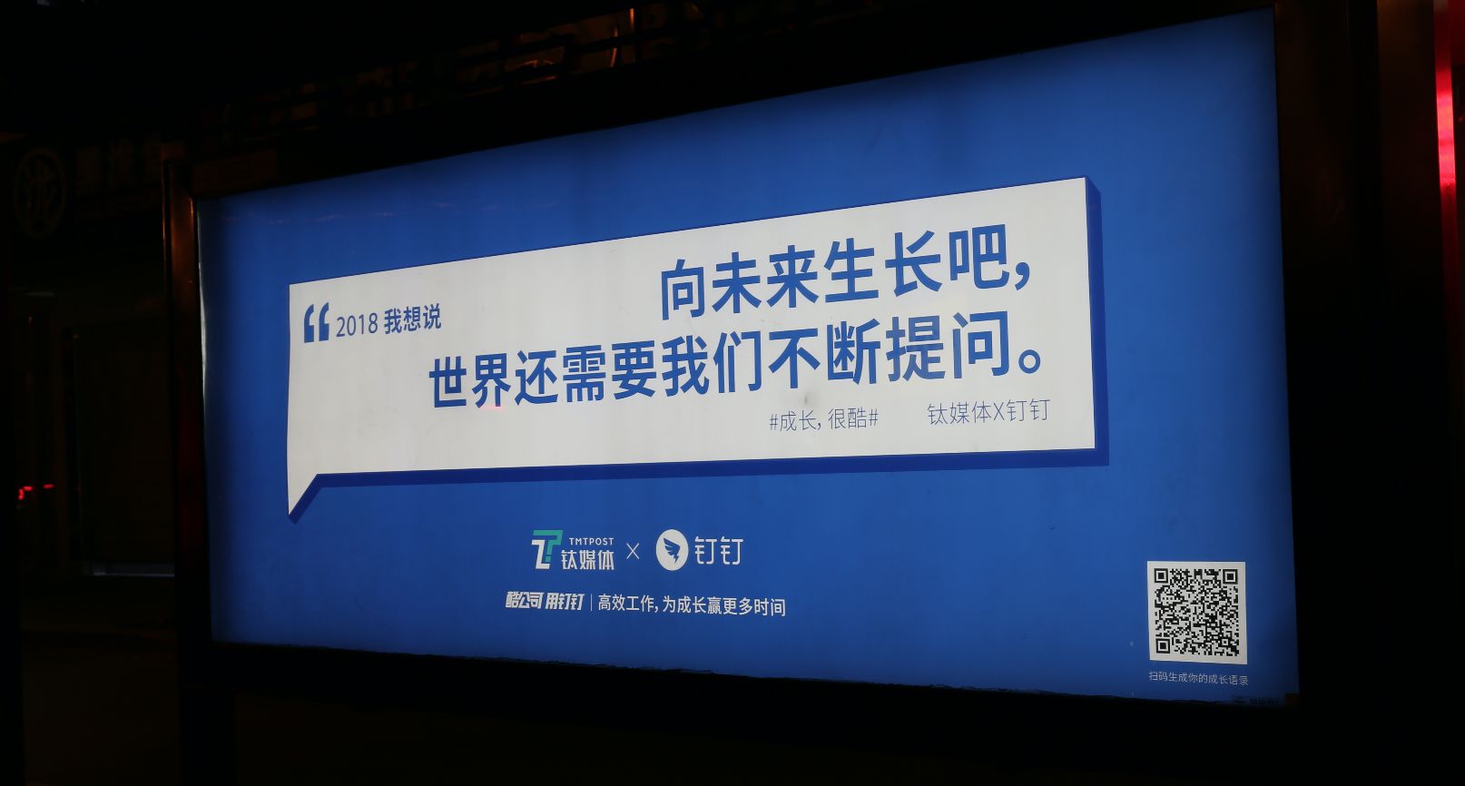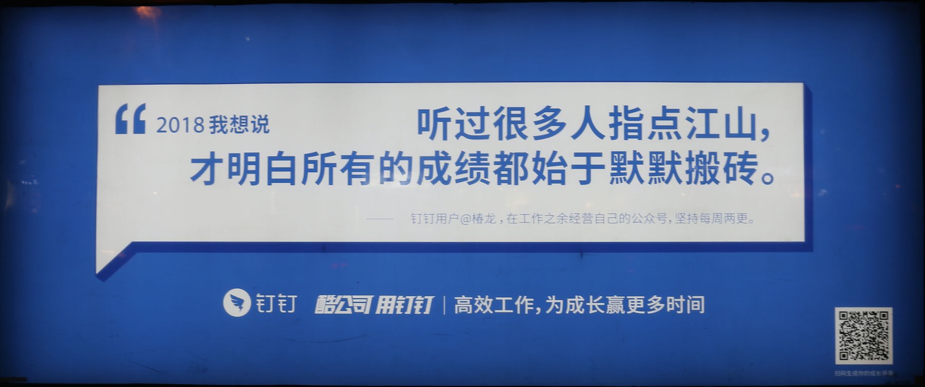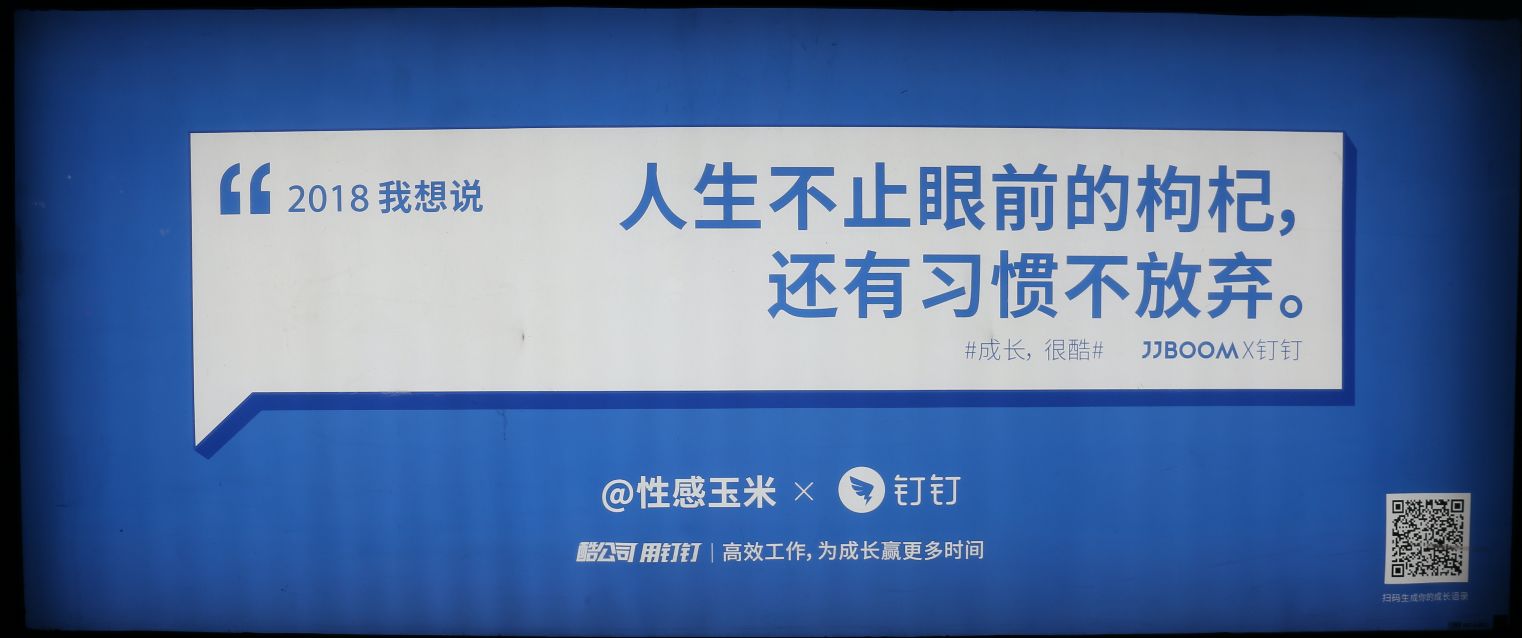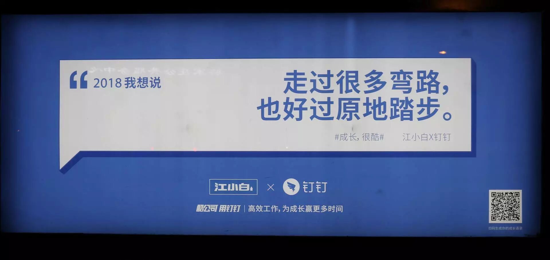 然而,就是在这个“人一励志,上帝就发笑”的风气下,马云的阿里巴巴钉钉却反其道而行之,最近在候车亭投放了一组主题为“成长,很酷”的公交站台广告,联合了60多个品牌、媒体、自媒体展开了一场对于2018年的集体对话,这60余句新年寄语,打动了无数正在奋斗中的人: